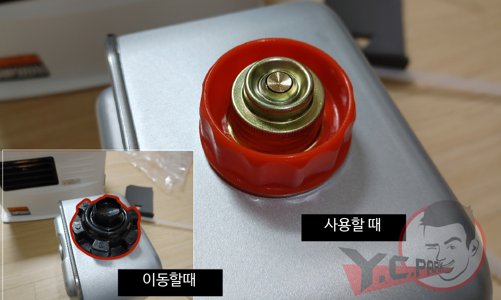 기름통을 빼면 구리로 된 모양인데 평소 팬히터를 사용하실 때는 이렇게 하시면 되고 기름이 통에 남아있는데 이동할 때는 누유 방지캡을 덧씌워서 팬히터에 장착하시면 됩니다. 그럼 흔들림 없이 고정되고 기름이 흘러나오지 않습니다.