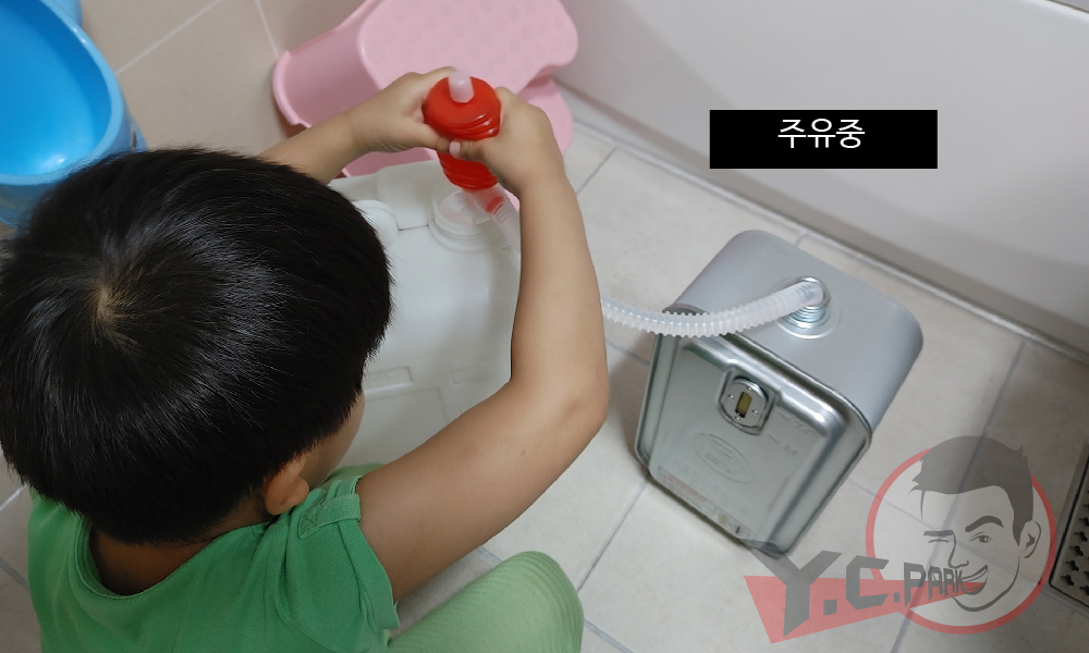 캠핑 전날 기름을 넣고 있는 제 이쁜 아들입니다. 재미있는지 계속하겠다고 하네요. 화장실 바닥에 몇 방울 떨어지니 기름이 잘 지워지지 않고 냄새도 많이 나니 화장실이라고 대충 흘리시면 안될 듯 하네요. 실내등유(백등유)는 투명해서 바닥에 흘려도 미관상 보이지는 않습니다.